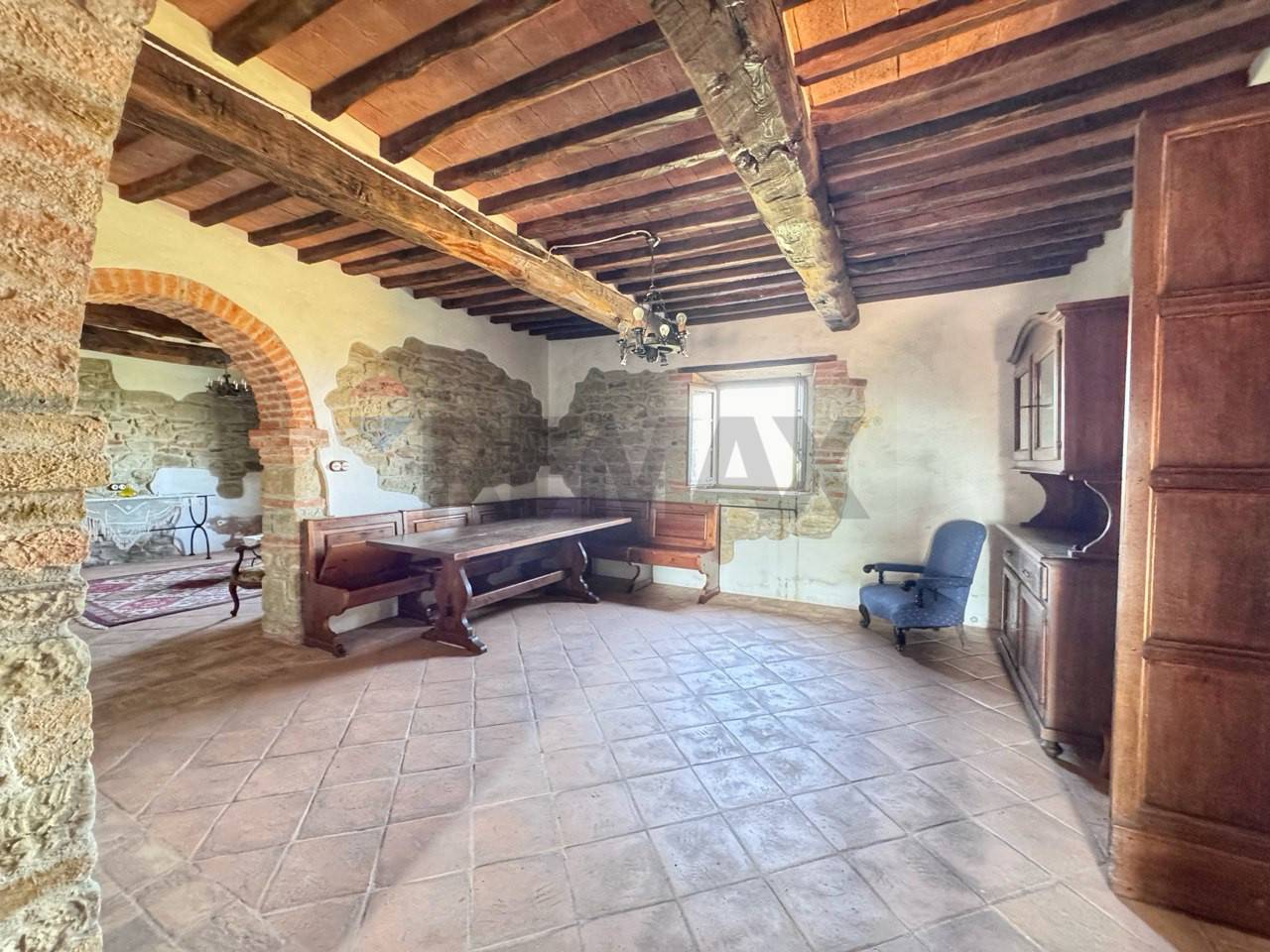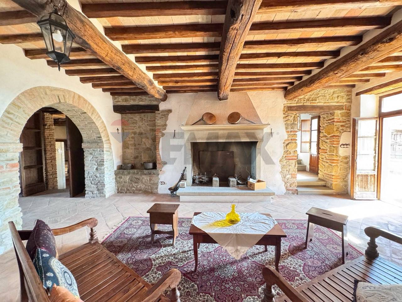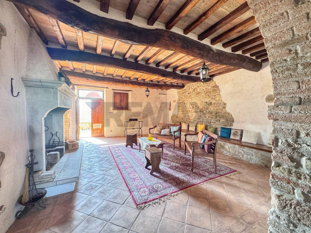 Porzione di casale in pietra in Fraz. Ranzola vicino a Lippiano al confine tra Toscana e l\'Umbria. Immerso nel verde delle colline al confine tra Toscana e Umbria, nella caratteristica Frazione di Lippiano (comune di Monte Santa Maria Tiberina (PG) ), proponiamo in vendita una suggestiva porzione di casale in pietra parte di un piccolo borgo rurale del fascino autentico. La proprietà si sviluppa su due livelli ed è composta da : ampio soggiorno con camino, tinello , piccolo salotto, cucina abitabile , dispensa e bagno al piano terra. Mentre al piano superiore dove si accede da una scala interna troviamo 4 camere matrimoniali e 3 bagni, due camere matrimoniali hanno entrambi bagni in camera e soppalchi dove poter usufruire lo spazio per dormire . Questa porzione di casa in vendita si presenta come un\'ottima opportunità per una struttura ricettiva. Lo stato attuale dell\'immobile è tenuto in ottime condizioni è stato ristrutturato recentemente con attenzione sui materiali mantenendo lo stile del rustico, i suoi pavimenti in cotto fatti a mano, le pareti tinteggiate all\'antica con calce bianca su base rossa e i suoi muri in pietra rendono tutto unico, arredato con gusto e migliorie di pregio. La casa viene riscaldata da riscaldamento a pavimento e ha un impianto a domotica. La porzione ha tre entrate indipendenti al piano terra e la quarta entrata al primo piano dove è servita da una grande terrazza coperta dove si può ammirare il bel paesaggio sulle colline toscane. All\' esterno troviamo un\'ampio patio con tettoia vicino al patio si trova una nicchia con un forno a legna, di proprietà un giardino di 500 mq circa con una jacuzzi che si affaccia sul paesaggio. ( leggi di meno )