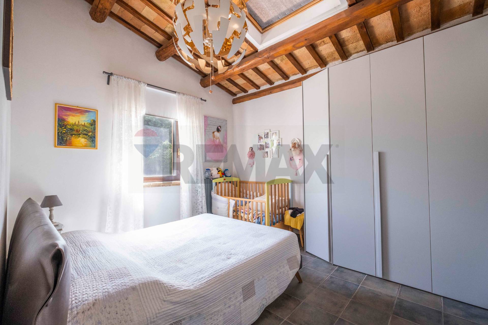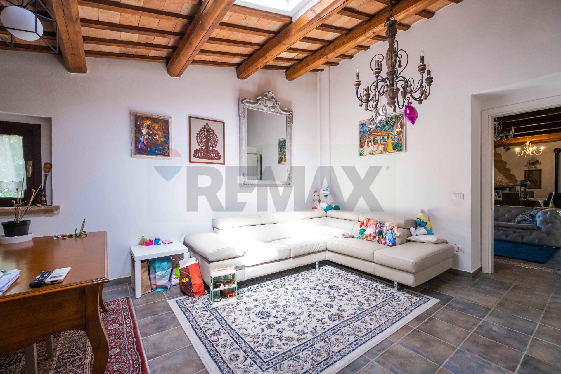 Casale Rosa Antico Uno splendido casale, immerso nella quiete delle colline marchigiane. Un immobile completamente restaurato, nel rispetto della tradizione rurale marchigiana, preservando lo stile architettonico originale. Il terreno annesso alla proprietà è completamente recintato e ricco di piante. Una soluzione perfetta per vivere a contatto con la natura, ma vicina a tutti i confort dei servizi nelle immediate vicinanze. Ubicato in una posizione strategica, a 3 km dal paese, dalla superstrada ed a soli 30 minuti da Ancona e dall\'Aeroporto di Falconara Marittima, con voli giornalieri interni ed internazionali. Dall\'ingresso principale che si affaccia sul cortile, arriviamo all\'ingresso interno del piano terra , con accesso a diverse zone della casa: a destra una porta conduce alla cucina, realizzata su misura, completamente attrezzata con tutti gli elettrodomestici, con locale dispensa. Al centro all\' ampio soggiorno con un grande camino, sapientemente restaurato con gusto. ed ingresso per bagno ed antibagno .Proseguendo dal soggiorno accediamo alla sala studio con libreria arricchita da una ulteriore stanza pluriuso predisposta anche per bagno ed attualmente usata come lavanderia. Tornando all\'ingresso sulla sinistra uno studio . Il piano terra è dotato di stufa a pellet ed impianto di condizionata. Sempre dall\'ingresso sulla destra, una bella scala decorata, ci accompagna al primo piano, dove ci accolgono due camere matrimoniali ed una cameretta tutte con cabina armadio, un bagno con vasca e per concludere una bella camera matrimoniale padronale, con bagno comunicante. Sulla corte esterna insiste un garage di 45 mq completamente ristrutturato, da completare solo per gli infissi e la porta di ingresso. Stiamo parlando di una Casale che sa di natura, dove il canto degli uccelli si unisce con i caldi colori e la luminosità di una giornata estiva. Pronta per essere abitata ( leggi di meno )