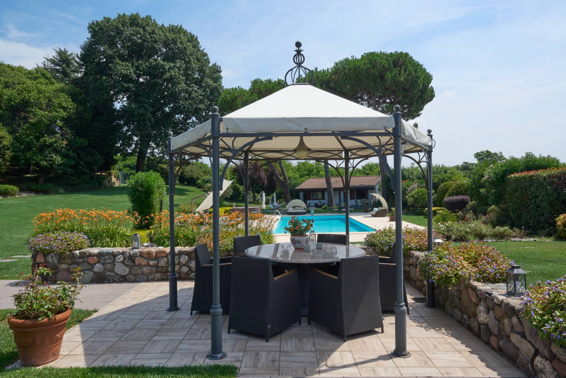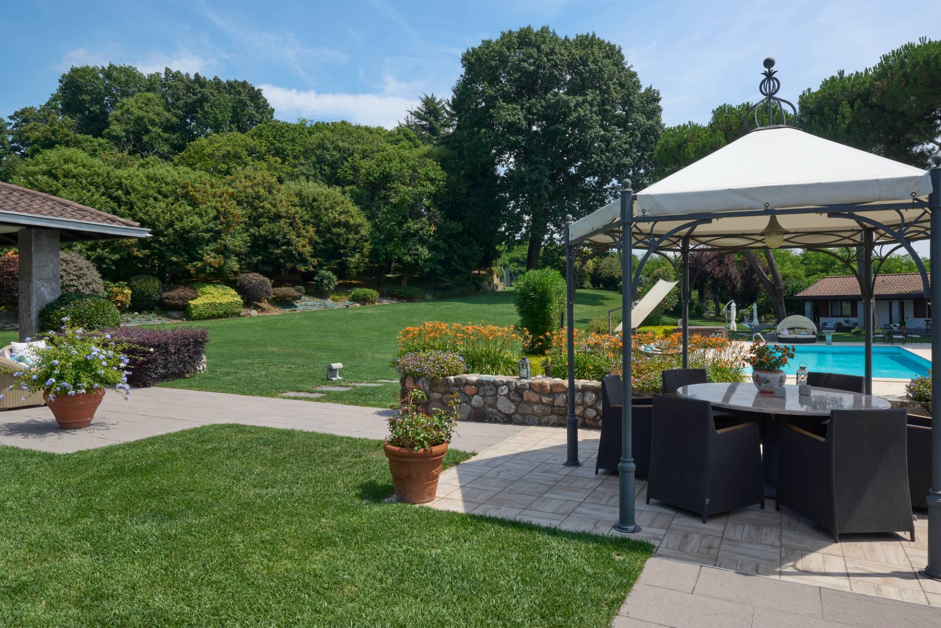 Prestigiosa Villa in Stile Bungalow con Parco Privato e Servizi Esclusivi All\'interno di unoasi di assoluta quiete, questa raffinata villa in stile bungalow si estende su una superficie di 420 m², immersa in un magnifico parco privato di 20.000 m², dove privacy, eleganza e natura si fondono armoniosamente. Gli interni della villa esprimono un equilibrio perfetto tra sobrietà e raffinatezza: Quattro camere da letto, di cui due ampie padronali con bagni privati Quattro bagni in totale, finemente rifiniti Studio privato, ideale per la lettura o il lavoro in piena tranquillità Salone accogliente con camino e bar, pensato per ricevere e rilassarsi in grande stile Sala da pranzo separata e cucina abitabile, completamente attrezzata Garage doppio e alloggi per il personale di servizio, discreti e funzionali Completa la proprietà una dependance indipendente, concepita come un appartamento per gli ospiti, dotata di ogni comfort. Ogni dettaglio di questa dimora è stato pensato per offrire unesperienza di vita esclusiva: Piscina riscaldata, perfettamente integrata nel paesaggio, per momenti di relax in ogni stagione SPA privata con solarium in sabbia naturale, bagno turco tradizionale e jacuzzi, per un benessere quotidiano senza compromessi Campo da tennis e area per bocce, ideali per il tempo libero allaria aperta Spazio predisposto per elisuperficie, che garantisce la massima comodità nei collegamenti Suggestiva veranda coperta nel cuore del giardino, attrezzata con barbecue in muratura e forno a legna tradizionale, perfetta per cene conviviali e serate allinsegna del gusto Completa la soluzione una cantina climatizzata in stile rustico, con scaffalature dedicate per la conservazione del vino a temperatura controllata un ambiente affascinante per custodire etichette pregiate e accogliere Una residenza unica, dove il lusso incontra lautenticità, perfetta per chi desidera vivere immerso nella natura, circondato da spazi generosi e da dettagli di ineguagliabile prestigio. ( leggi di meno )