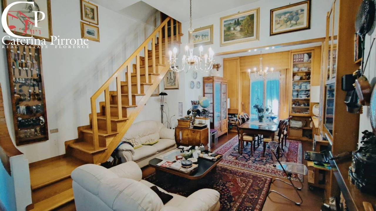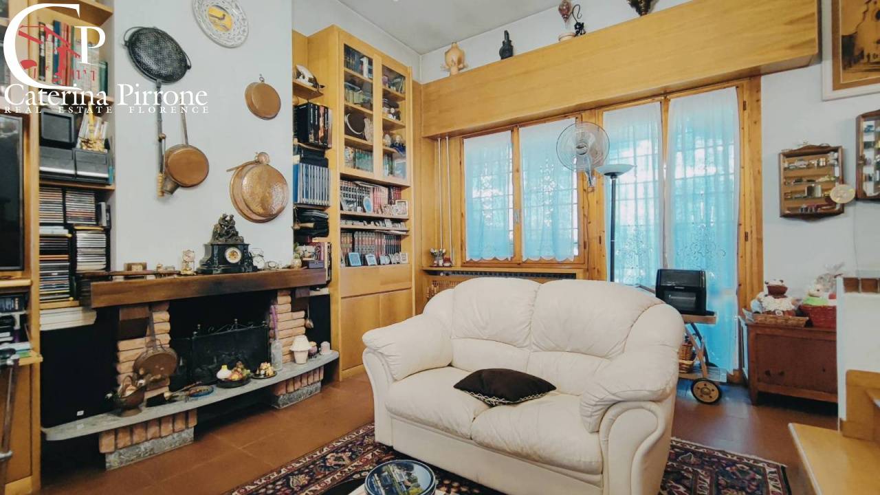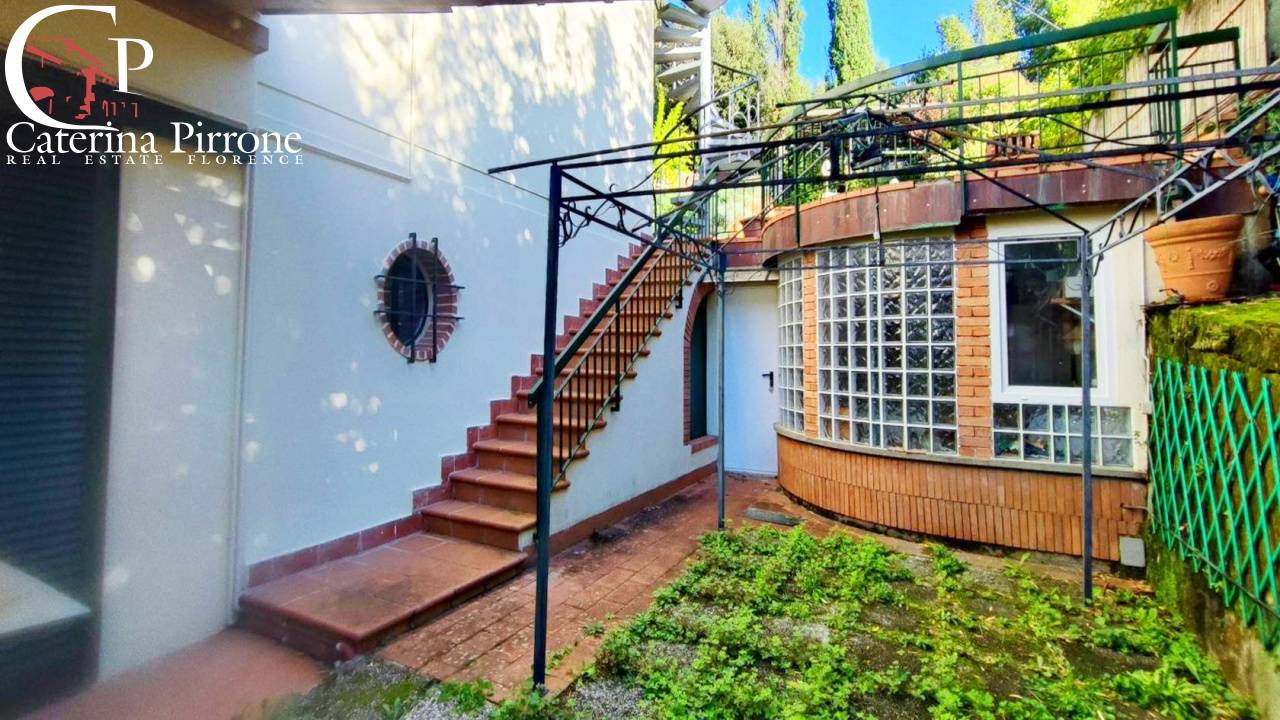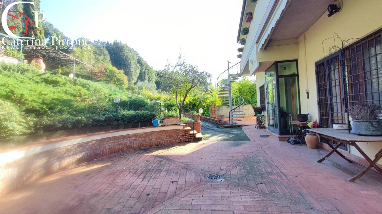 Bagno a Ripoli, località Grassina, in posizione collinare nel verde, ma vicino ai servizi, vendesi villa moderna libera su 4 lati e disposta su tre livelli, con bel giardino di circa mq.450, oltre posti auto e cantina. L\'immobile degli anni \'70 è ben tenuto: al piano terreno è composto da ingresso diretto da giardino esterno, grande salone doppio con caminetto e scala di accesso al piano primo, cucina abitabile con balcone tergale di servizio, sala pranzo, camera matrimoniale e servizio finestrato; al piano seminterrato ci sono ulteriori due camere matrimoniali con servizio e un ampio vano (parzialmente seminterrato) ad uso cantina/studio/locale di servizio. Al piano primo, accessibile dall\'interno del soggiorno con bella scala in legno, o in alternativa accessibile da scala esterna (in modo da rendere il piano primo indipendente e separato e perciò usufruibile come appartamento autonomo), troviamo soggiorno con caminetto e accesso alla bella terrazza frontale, cucinotto, due camere e due servizi. Esternamente giardino di mq.450 circa sui 4 lati dell\'immobile, cantina tavernetta esterna indipendente dotata di forno a legna, e due posti auto coperti di proprietà. Cisterna 10.000 litri acqua piovana per irrigazione automatica. Interni in buone condizioni, rispecchiano l\'epoca di costruzione. Immobile ampio e flessibile nelle varie soluzioni abitative, adatto anche a due nuclei familiari. Euro 650.000 MER21 ( leggi di meno )